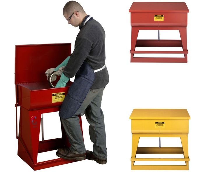 Le vasche ad immersione in metallo JUSTRITE sono dotate di coperchi a chiusura automatica azionati da un pedale. Un cilindro pneumatico regolabile impedisce la chiusura del coperchio quando il pedale viene rilasciato