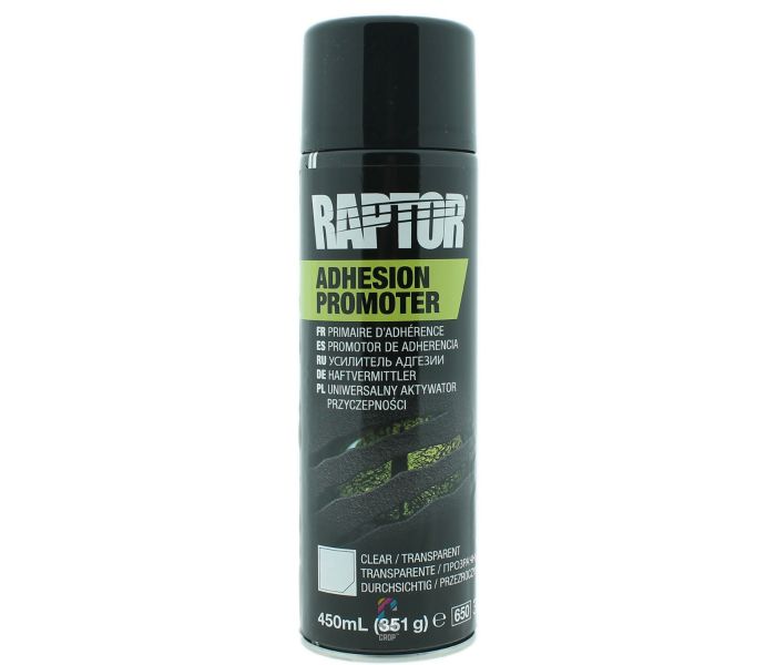 Raptor Liner Adhesion Promoter è un primer universale che aderisce a qualsiasi substrato. Una volta asciutto, il promotore di adesione può essere spruzzato con vernice bedliner, vernice a base di solventi, vernice a base d'acqua e vernice automobilistica convenzionale.