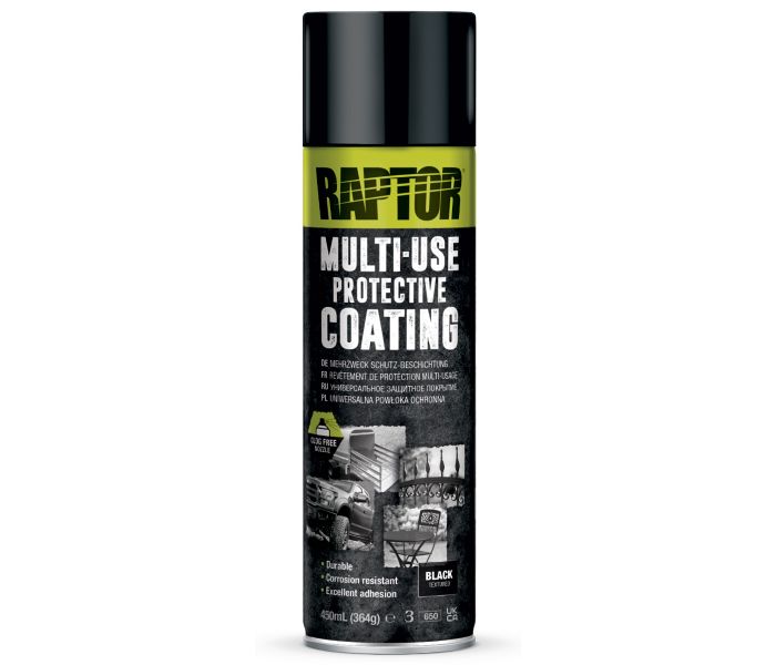 Raptor Multi-Use Protective Coating è una vernice strutturata ad asciugatura rapida che aderisce a metallo, alluminio, vetroresina, plastica, legno e altri materiali, si asciuga rapidamente, è resistente all'abrasione e resiste a graffi, schegge di pietra, urti, ruggine, corrosione, acqua e a tutte le condizioni atmosferiche. La bomboletta spray Raptor Liner Multi-Use ha la finitura strutturata di un vero rivestimento bedliner! Con questo pratico spray, è possibile spruzzare facilmente e rapidamente le superfici desiderate con una vernice bedliner nera.