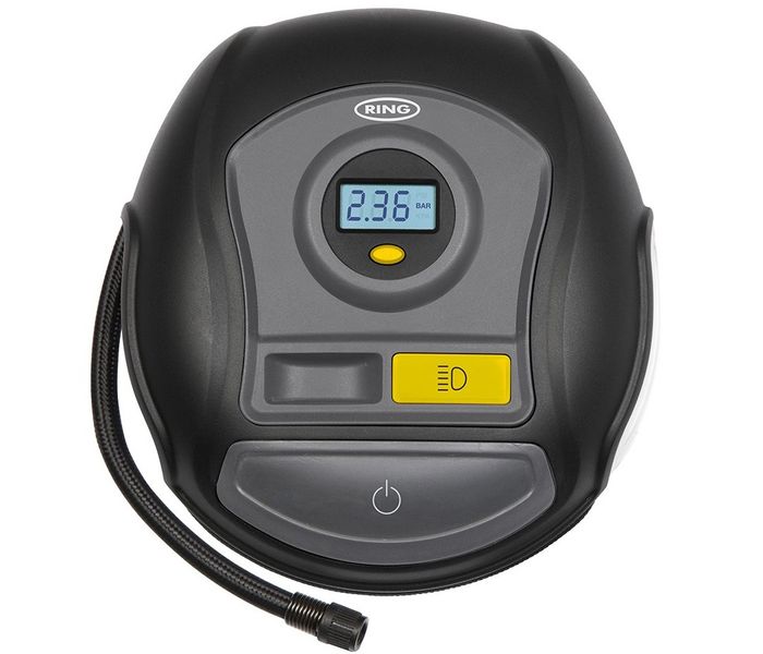 RING Digital Tyre Pump 12V con compressore d'aria incorporato per gonfiare automaticamente pneumatici di auto, biciclette, palloni da calcio, letti ad aria e altro ancora. Questa pompa per pneumatici con connessione a 12 V si collega all'accendisigari dell'auto, dopodiché il dispositivo soffia automaticamente aria. La pompa per pneumatici RING è dotata di luci a LED per illuminare le riparazioni di emergenza o il cambio degli pneumatici al buio.