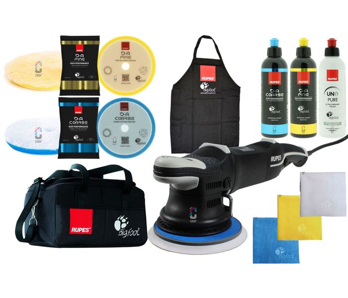 Il set LUX della lucidatrice RUPES LHR15 Mark III è il set di lucidatura più completo disponibile. Il set LUX della RUPES BigFoot LHR15 Mark 3 è composto dalla lucidatrice eccentrica RUPES Mark 3, da 2 tamponi di lana per la lucidatura, dalla nuova ruota RUPES D-A per la lucidatura grossolana e fine, dal composto RUPES D-A per la lucidatura grossolana e fine, da un grembiule e da una borsa RUPES MK III in cui è possibile riporre e trasportare tutto in modo ordinato. Con questo lussuoso set di lucidatrici, sarete dei veri e propri car detailer e avrete tutto il necessario per una lucidatura professionale.