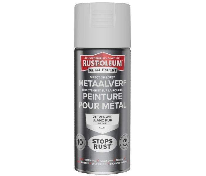 Rust-Oleum Metal Expert Direct On Rust Metaalverf è una bomboletta spray professionale con una vernice anticorrosione per ferro e acciaio che contiene un'esclusiva tecnologia 3 in 1: primer, mano intermedia e mano di finitura in un unico prodotto. Può essere applicata direttamente su metallo ferroso nudo, precedentemente verniciato o arrugginito.