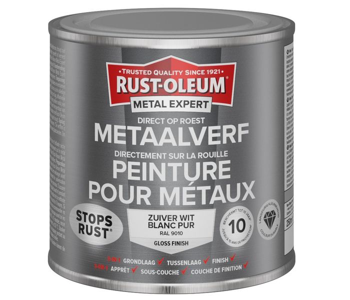 Rust-Oleum Metal Expert Direct On Rust Metaalverf è una vernice professionale anticorrosione per ferro e acciaio che contiene un'esclusiva tecnologia 3 in 1: primer, mano intermedia e mano di finitura in un unico prodotto. Può essere applicata direttamente su metallo ferroso nudo, precedentemente verniciato o arrugginito.