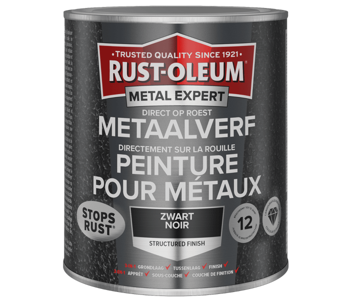 Rust-Oleum Metal Expert Direct Op Roest Structured Finish è una vernice per metalli con effetto testurizzato goffrato per ferro e acciaio che contiene un'esclusiva tecnologia 3 in 1: primer, strato intermedio e finitura in un unico prodotto e può essere applicata direttamente su metallo ferroso nudo, precedentemente verniciato o arrugginito.