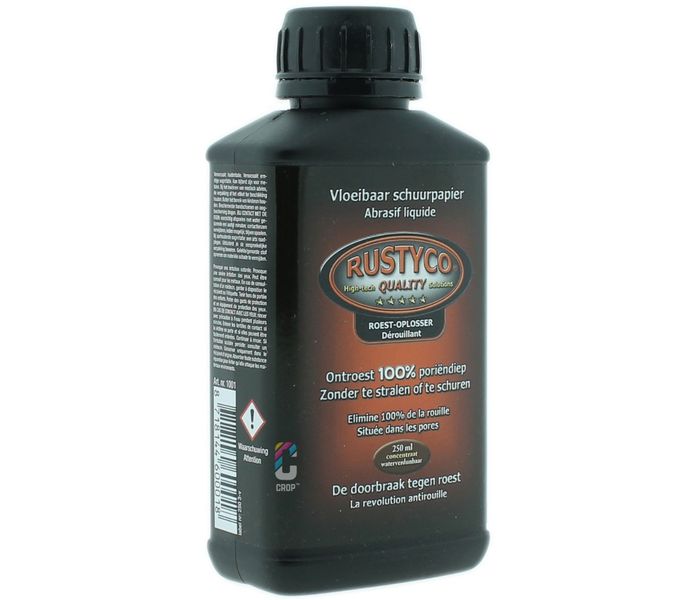 Il Dissolvi Ruggine Rustyco concentrato in un piccolo flacone da 250 ml è un liquido concentrato per trattare e rimuovere la ruggine. Questo antiruggine concentrato di Rustyco è molto potente e penetra in profondità nel metallo, ferro, acciaio, alluminio o acciaio inossidabile. Con Rustyco Rust Dissolver Concentrato, renderete il materiale al 100% privo di ruggine.