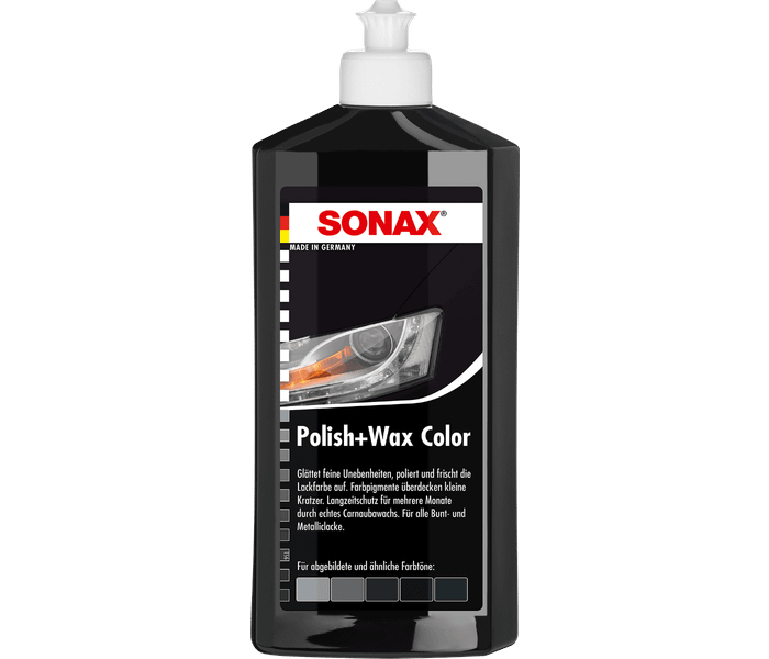 SONAX Polish + Wax Nero è un lucidante per auto con pigmenti neri sviluppato appositamente per la lucidatura di auto con vernice nera. Questa cera microabrasiva pulisce a fondo la vernice rimuovendo piccoli graffi superficiali dando una brillantezza assoluta all'auto. Poiché i pigmenti sono neri, questo polish aggiunge colore alla vernice conferendo all'auto un colore più intenso e facendola sembrare ancora più nera!