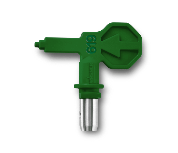 Ugello Wagner 619 con ugello 0,019 per la spruzzatura airless di pittura, pittura al lattice (murale), vernice, primer, fondo e tectyl. Questo ugello sciolto Wagner 619 ha un'ampiezza di spruzzo di 25 cm ed è adatto a essere sostituito se l'ugello attuale è usurato o se si desidera semplicemente uno nuovo. Grazie alla tecnologia HEA, l'ugello Wagner 619 riduce fino al 50% la nebbia di spruzzatura (nota anche come overspray) rispetto agli altri spruzzatori airless.