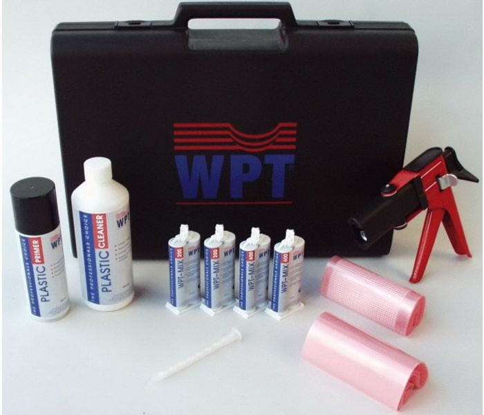 WPT Plastic Repair Starter kit WP6200 è un sistema poliuretanico bicomponente unico nel suo genere che può essere utilizzato per effettuare un'ampia gamma di riparazioni in plastica. La particolarità di WPT-Mix è che indurisce rapidamente, anche quando viene applicato in uno strato sottile.