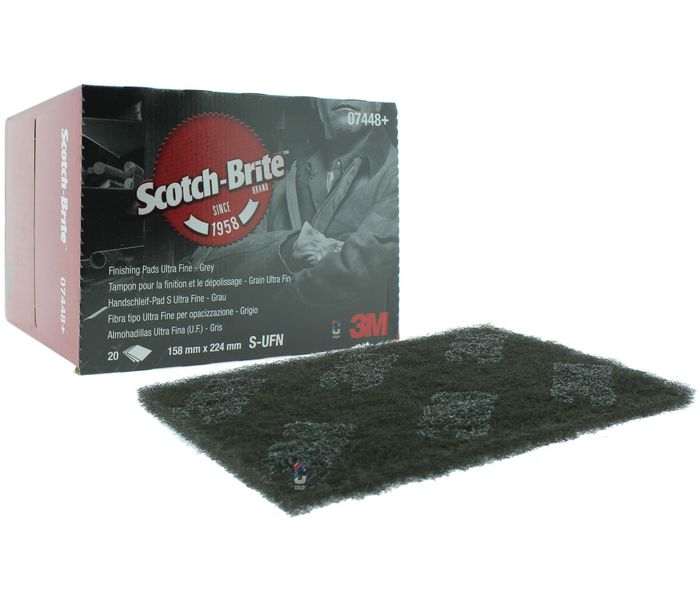 De 3M Scotch Brite GRIJS is een non-woven schuurpad die bestrooid is met fijne schuurkorrel aluminiumoxide. Dankzij het webmateriaal kan je met de Scotch Brite zowel droog als nat schuren. Gebruik water of ontvetter om nat te schuren. De mineralen van schuurkorrel krijgen een zeer fijn kraspatroon waardoor je een mooi gematteerd oppervlak krijgt!