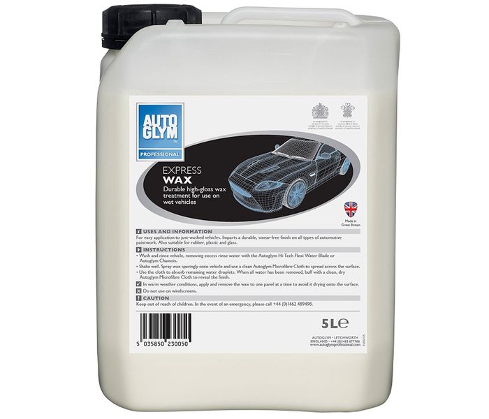 AUTOGLYM Professional Express Wax is een veelzijdige vloeibare carnauba wax in 5 liter verpakking. AUTOGLYM Express Wax zorgt er voor dat je auto weer straalt! Verder kunt je deze spray wax ook gebruiken op natte auto's en is hij geschikt voor alle type lakken inclusief metallic, zowel rubber als kunststof en glas. AUTOGLYM Express Wax geeft een glanzende streeploze afwerking met een langdurige bescherming tot wel 40 wasbeurten.