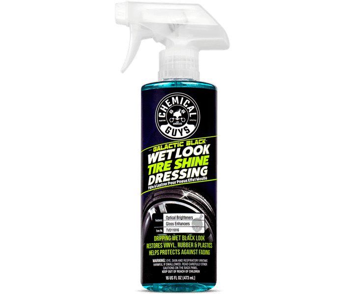 Chemical Guys Galatic Wet Look Tire Shine Dressing is een spuitbare dressing op waterbasis waarmee je meer glans en diepte krijgt op zwart van banden, rubber, vinyl en plastic. De bandendressing van Chemical Guys helpt toekomstige vervaging of uitdroging van rubber autobanden door zonlicht te voorkomen.