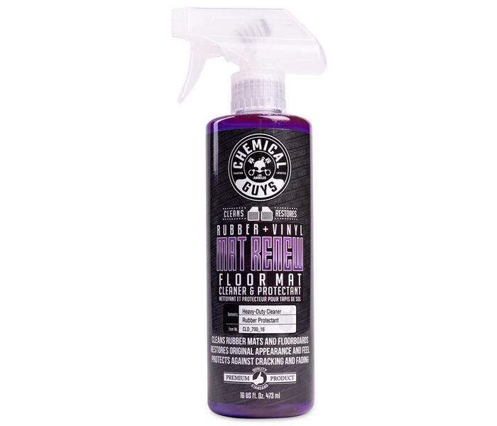 Mat ReNew van Chemical Guys breekt vuil, olie, vet, roet, voedsel- en drankresten van rubberen vloermatten af. Mat ReNew conditioneert rubberen matten om een diepzwart als-nieuw uiterlijk en een zacht, soepel gevoel te herstellen. Mat ReNew bevat UV-blokkers die diep in het rubber doordringen om continu schadelijke UV-stralen te blokkeren die rubberen vloermatten doen vervagen en aantasten.