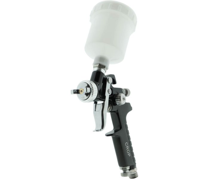 Mini Verfspuit van CROP voor het spuiten van lak, autolak, 2K lak en andere verfsoorten. De CROP mini verfspuit heeft een klein pistoolhuis, is licht in gewicht en heeft een 125ml bovenbeker waardoor de kleine verfspuit comfortabel in de hand ligt. Dankzij het compacte formaat is de mini verfspuit ideaal voor het spuiten van kleine onderdelen en oppervlakken of velgen, spiegelkappen, een spoiler of dorpel.