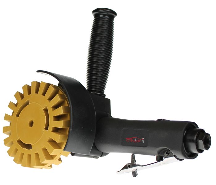 Machinaal stickers verwijderen doe je met deze slijper. De pneumatische stickerverwijderaar is een speciale machine om te gebruiken met een caramelschijf. Dankzij het ergnomisch design ligt de slijpmachine comfortabel in de hand tijdens het verwijderen van stickers en lijmresten. Het toerental is begrensd waardoor je niet bang hoef te zijn om te veel snelheid te maken.
