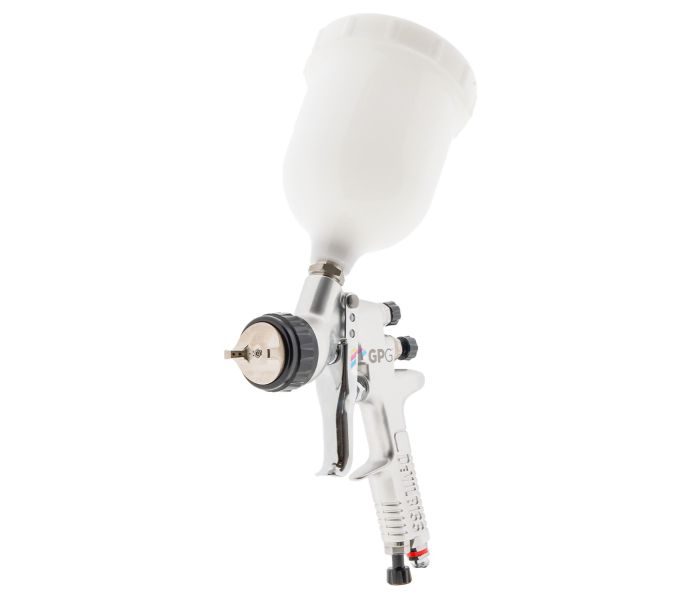 DeVilbiss GPG Verfspuit is een multifunctioneel bovenbeker spuitpistool voor verf, autolak, beits en 2-componenten lak. Met de DeVilbiss GPG Verfspuit kan je zowel conventionele lak als verf op waterbasis spuiten. Dankzij de hoogwaardige luchtkap heeft dit verfspuitpistool een prachtig spuitbeeld voor een strak eindresultaat.