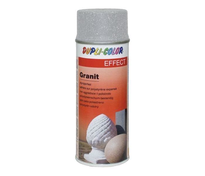 DupliColor Graniet Verf spray GRIJS voor het spuiten van ieder object, oppervlak of onderdeel in de kleur grijs met een effect van graniet. De grijze graniet verf spuitbus hecht op alle materialen en blijft jarenlang zitten. Om het beste resultaat te behalen met deze steen graniet verf spray, adviseren wij om de ondergrond in een primer te spuiten die licht van kleur is. Dankzij de hoge kwaliteit kan je de DupliColor spuitbus graniet look verf zowel buiten als binnen gebruiken.