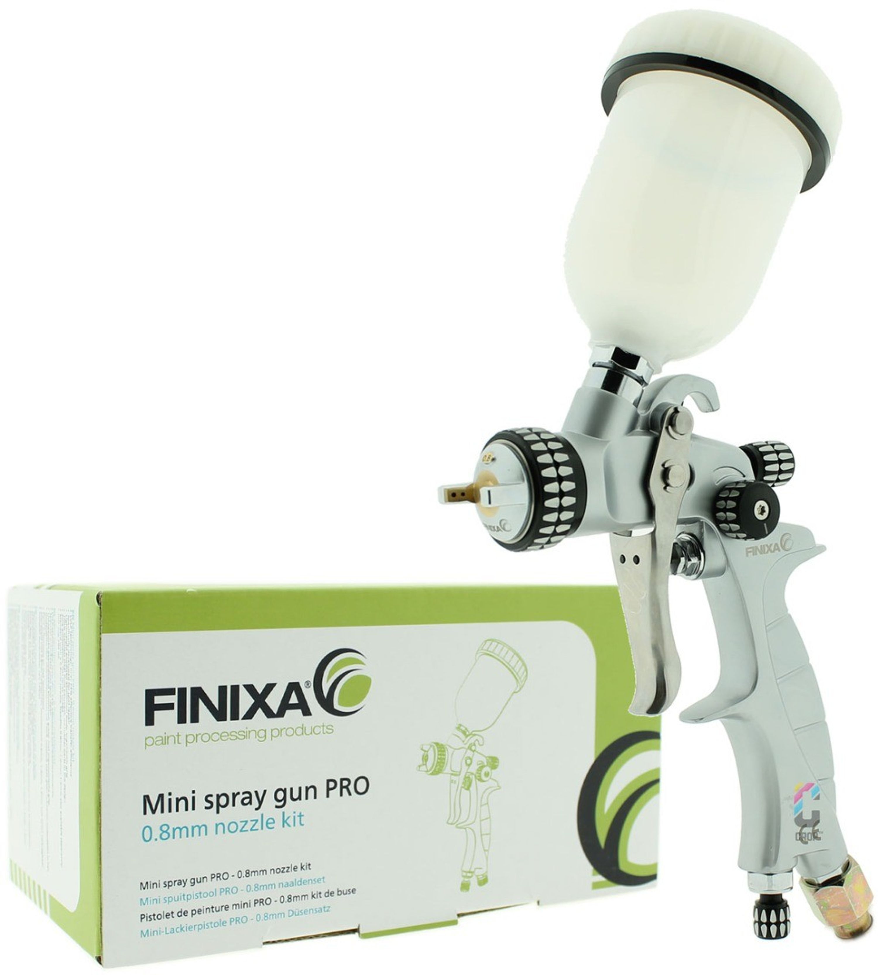 De mini verfspuit met 0,8mm nozzle is ideaal geschikt om op professioneel niveau kleine onderdelen of oppervlakken te spuiten. Dankzij de 0.8 sproeieropening i.c.m. de LVLP luchtkap, zorgt dit kleine spuitpistool voor weinig overspray met een zeer strak dekkende verneveling van iedere verf. Hierdoor is de FINIXA PRO MINI ook uitgeroepen tot het beste spotrepair verfspuitpistool!