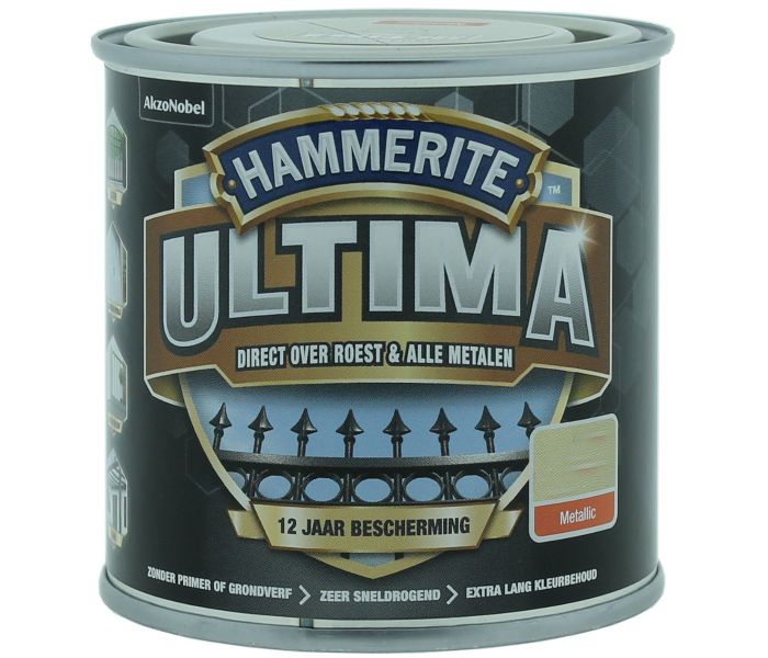 Hammerite Ultima Metallic Metaallak om hoogwaardig metaal te verven in een metallic kleur met een hoogglans afwerking. De glanzende Hammerite Ultima Metallic metaallak kan je over alle soorten metaal verven zonder primer. Hammerite Ultima Metallic is de beste metaalverf die tot wel 12 jaar bescherming biedt, sneldrogend is en extra lang zijn kleur behoud dankzij de Colour Lock Technology. Deze Hammerite Ultima metallic metaallak is leverbaar in 2 kleuren met glitters en een hoogglans finish.