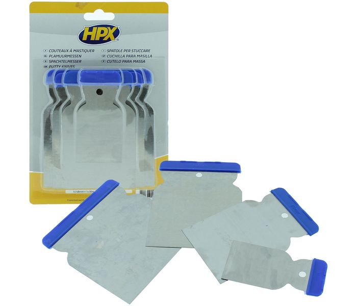 HPX Plamuurmessen bestaande uit 4 japanspachtels voor het mengen en aanbrengen van plamuur. Deze hoge kwaliteit plamuurmessen zijn oplosmiddelbestendig en gemaakt van sterk kunststof met metaal. De 4 plamuurmessen zijn flexibel waardoor je plamuur zeer goed kan gladstrijken voor de beste afwerking.