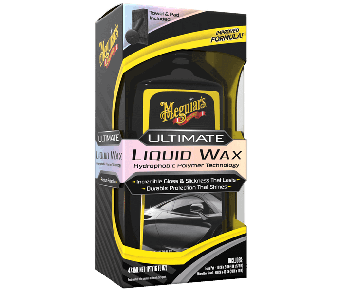 De set wordt geleverd met Meguiar's Ultimate Liquid Wax, microvezel doek en een applicator pad.