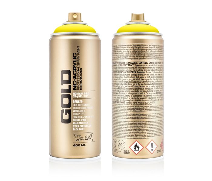 Montana graffiti spuitbus 100% Yellow uit de GOLD-serie zit verpakt in een lage druk spray. Doordat de Montana GOLD spuitbus een low pressure spray is kan je de graffiti verf zeer gecontroleerd spuiten met een optimale controle over het resultaat. Deze Montana GOLD 100% Yellow P1000 spuitbus lak droogt zijdeglans en snel op, ook bij koude temperaturen. Dankzij de speciale anti-drip formule voorkom je zakkers!