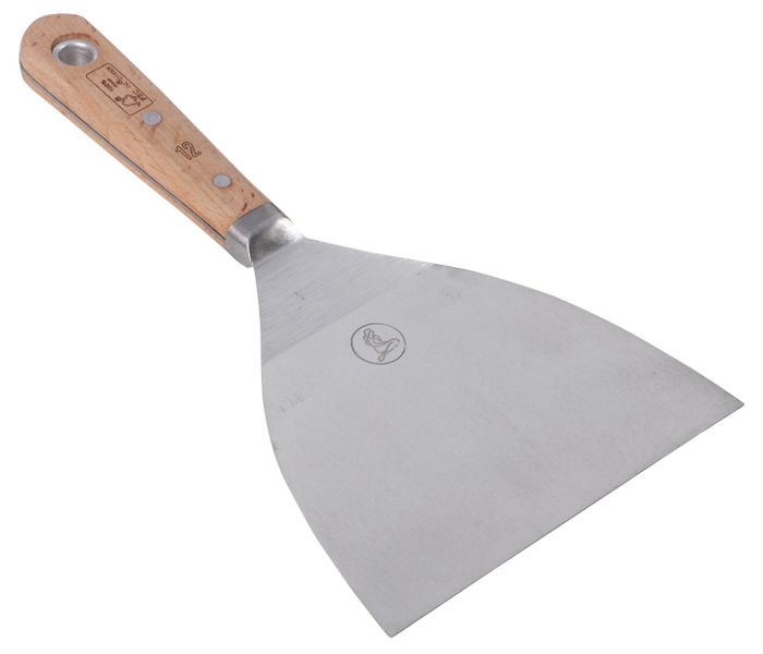 12cm plamuurmes Engels model van gehard staal voorzien van gesmede knop en messing band. Dit 12cm plamuurmes is vakkundig geslepen en van professionele kwaliteit.