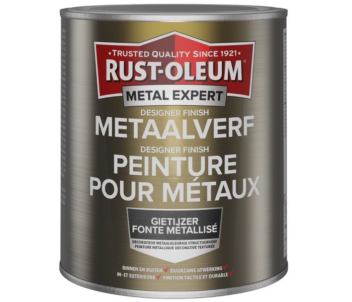 Rust-Oleum Metal Expert Designer Finish Metaal Verf is een decoratieve metaalverf met een mooie metallic structuurafwerking die de look en feel van echt gietijzer heeft. Een hoogwaardige verf voor gebruik op ferrometalen, licht gestructureerd om gietijzer te imiteren.