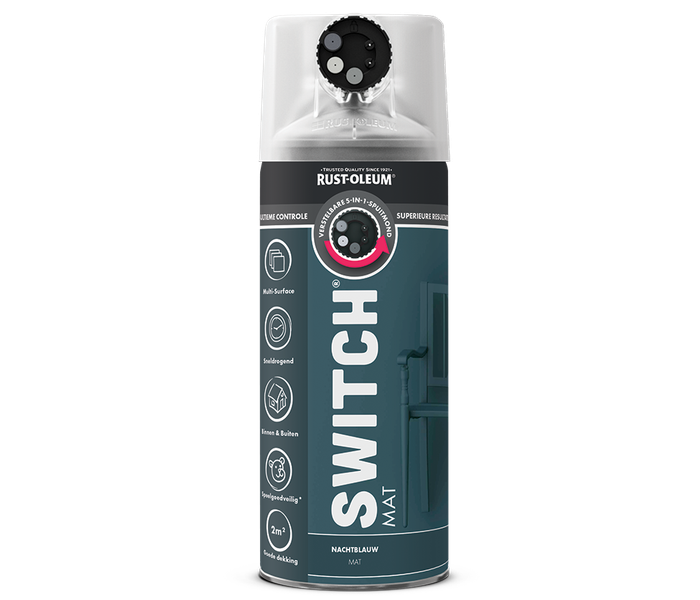Rust-Oleum Switch is een spuitbus verf met een unieke 5-in-1 spuitmond waarmee je eenvoudig vijf verschillende spuitpatronen instelt. Dit geeft optimale controle over verfopbrengst en richting waardoor je altijd een strak en professioneel resultaat bereikt. Dankzij de geavanceerde technologie spuit je met meer precisie, minder nevel en maximaal comfort. De spuitlak is geschikt voor diverse ondergronden, droogt snel en is toepasbaar binnen en buiten.