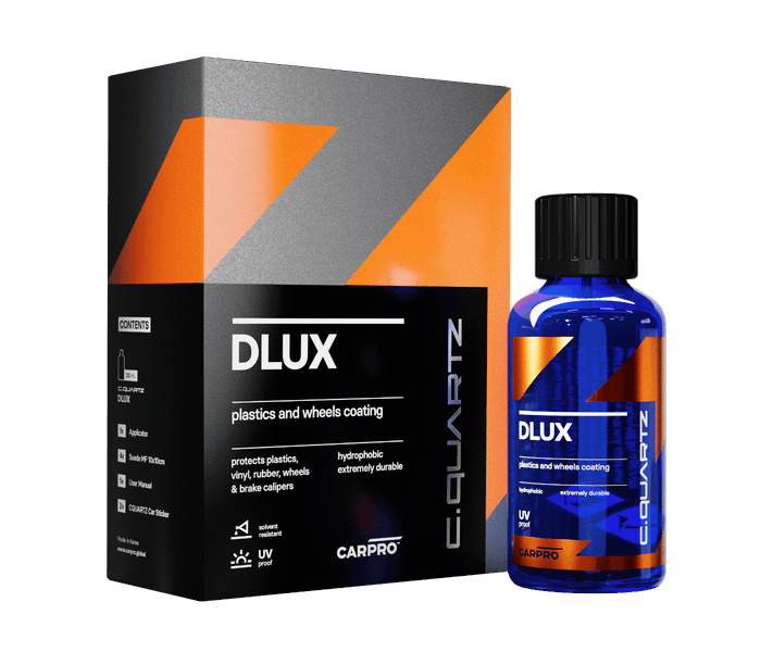 CQuartz DLux od CarPro różni się od oryginalnej formuły CQUARTZ tym, że DLux zawiera ponad 50% czystej krzemionki! Krzem jest tym, z czego zbudowane jest szkło, dzięki czemu DLux jest zasadniczo szklaną powłoką dla plastikowych i gumowych powierzchni zewnętrznych pojazdu. Dodatkową korzyścią jest to, że głównym składnikiem DLux jest organosilan, który odpycha wodę i brud z powierzchni. CQUARTZ DLux nadaje plastikowym i gumowym powierzchniom zewnętrznym fabryczne wykończenie, które dłużej pozostaje czyste. Odporna na promienie UV i wilgoć, ceramiczna powłoka ochronna utrzymuje się nawet przez rok!