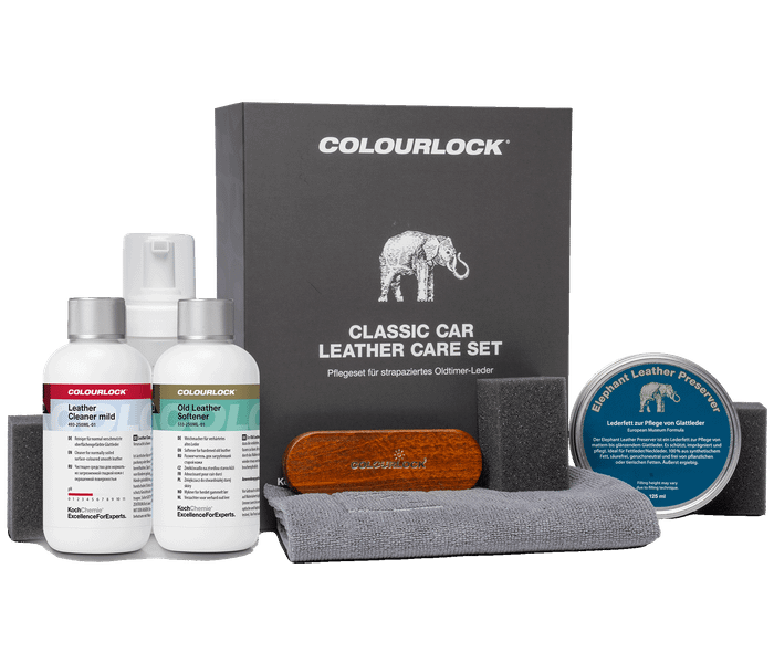 Skóra w samochodach zabytkowych musiała wiele znieść przez lata i dlatego zasługuje na szczególną uwagę i troskę. Światło słoneczne, wahania temperatury i lata użytkowania powodują, że skóra wysycha, odbarwia się i traci elastyczność. Zestaw Colourlock Oldtimer Leather Care Set intensywnie czyści i odżywia starą skórę, dzięki czemu odzyskuje ona swoją naturalną strukturę i blask. Ochrona skóry tworzy warstwę ochronną, która zapobiega odwodnieniu i dalszemu starzeniu.