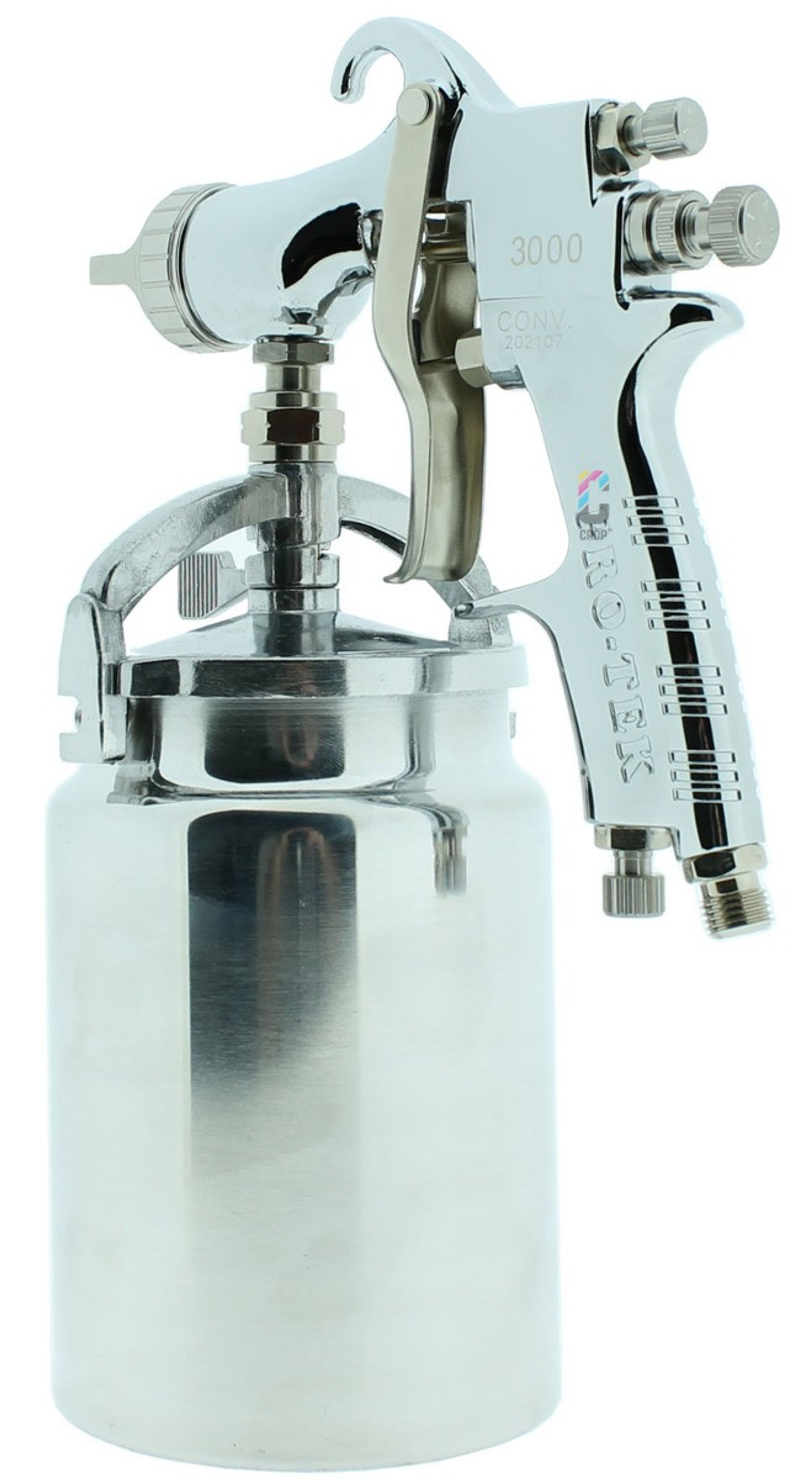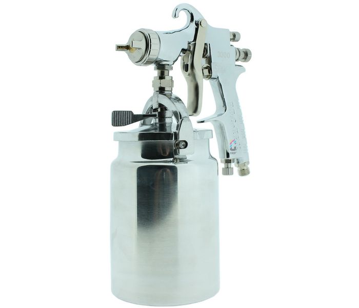 PRO-TEK 3000 Opryskiwacz dolnym kubkiem z nasadką HVLP do natryskiwania wszystkich rodzajów lakierów, farb i powłok. Ten opryskiwacz HVLP z dolnym zbiornikiem nadaje się do farb na bazie rozcieńczalników i wody. Dolny zbiornik ma rurkę ssącą, przez którą farba jest podawana do opryskiwacza. Dzięki wysokiej jakości ten pistolet natryskowy z dolnym zbiornikiem nadaje się do zastosowań przemysłowych i profesjonalnych.