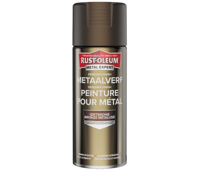 Rust-Oleum Metal Expert Stylowe Wykończenie Farba Do Metalu to dekoracyjna farba do metalu z pięknym, metalicznym wykończeniem o fakturze imitującej prawdziwy brąz. Wysokiej jakości farba do stosowania na metalach żelaznych, z lekką teksturą imitującą odlew z brązu.