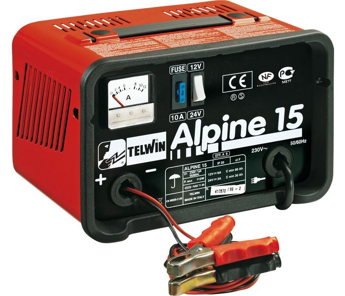 TELWIN ALPINE 15 to przenośna i kompaktowa ładowarka do ładowania akumulatorów elektrolitowych 12V i 24V (WET). Natężenie prądu ładowania 9 A i moc wyjściowa 110 W. Zabezpieczenie przed przeciążeniem i nieprawidłowym podłączeniem. Metalowa obudowa. Przełącznik do wyboru między ładowaniem normalnym i szybkim. Z amperomierzem.
